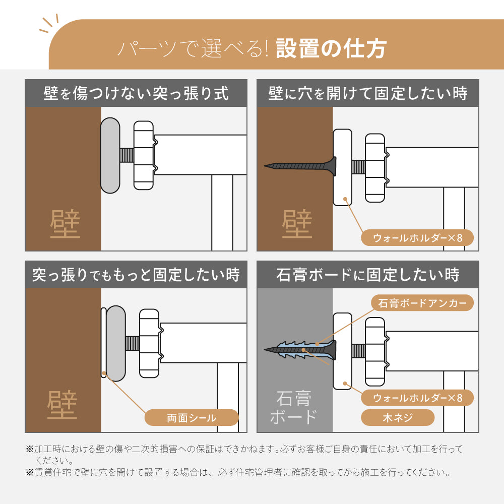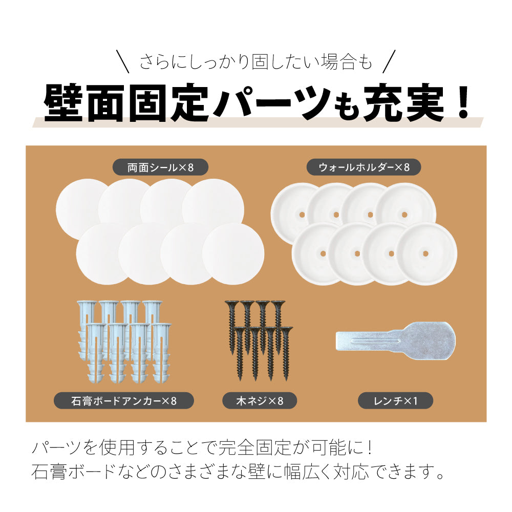 組み立て説明書、ドライバー、レンチ、調節ボルト、木ネジ、石膏ボードアンカー、ウォールホルダー、両面シール |